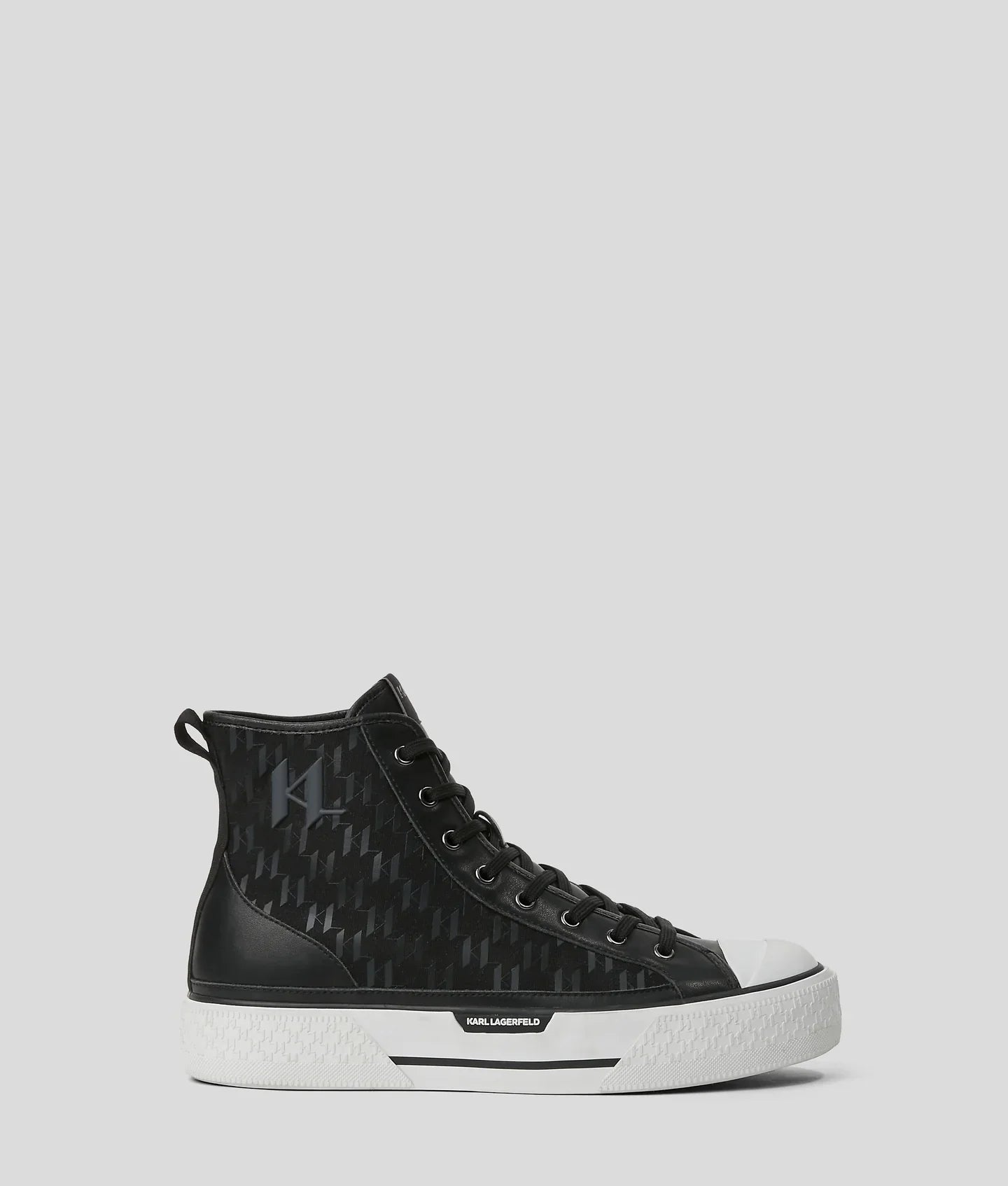 Crafted from premium Italian canvas, these KARL LAGERFELD high tops offer an elevated stance with their lofty plateau soles while ensuring a snug embrace with a classic lace-up design, all accented by the exclusive KARL NFT logo at the ankle.